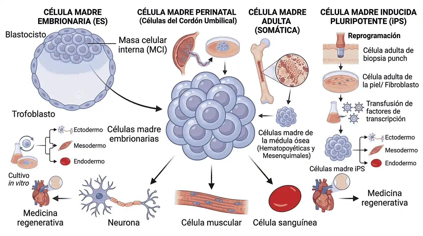 Esquema de los distintos tipos de células madre según su origen