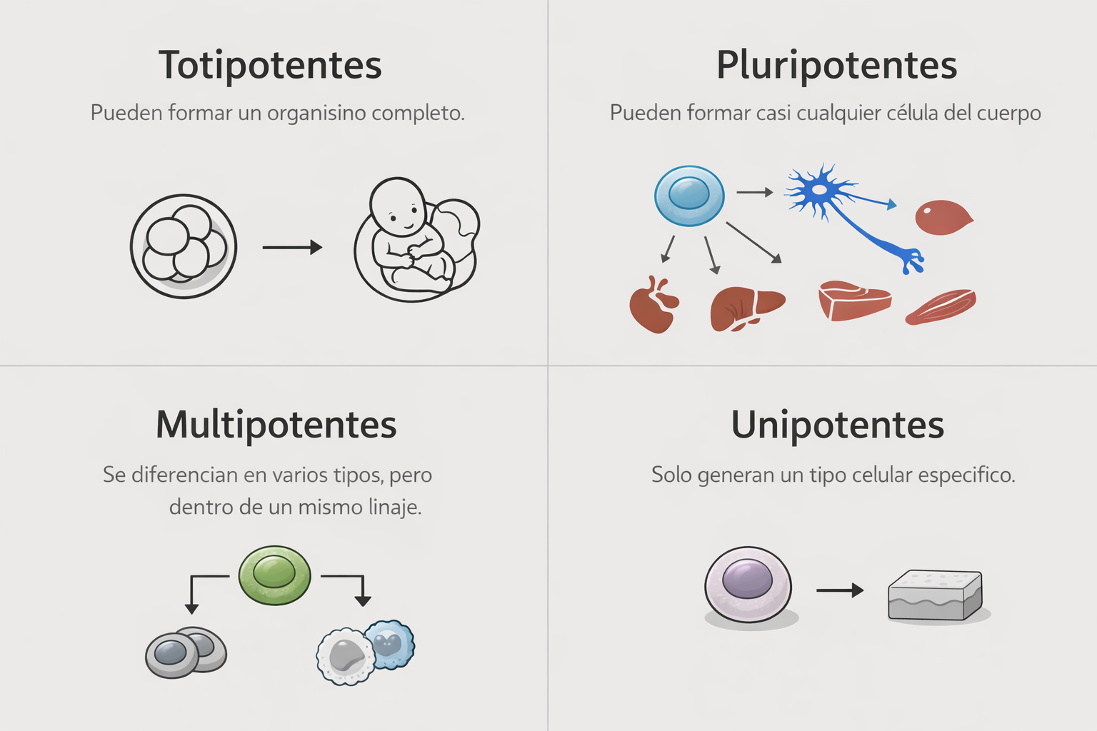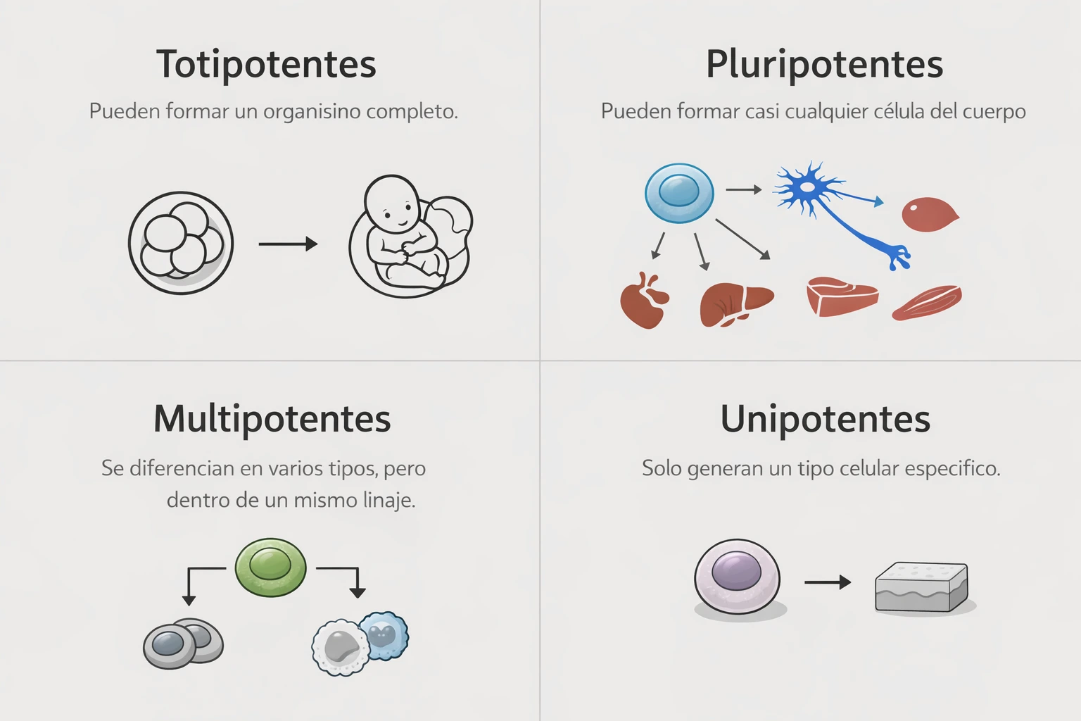 - Diferenciarse en distintos tipos celulares (piel, hueso, músculo, neuronas, etc.).