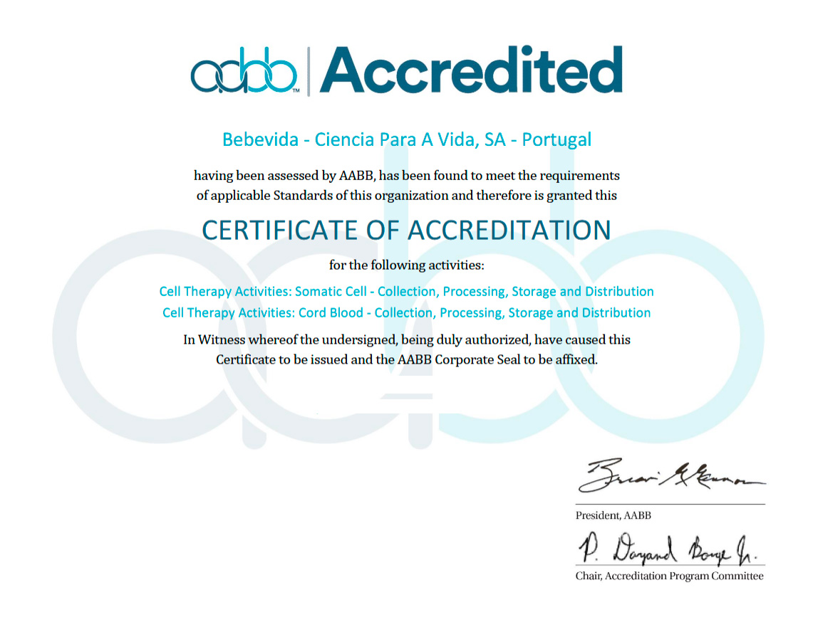 También está acreditado por AABB. La Asociación Americana de Bancos de Sangre garantiza el cumplimiento de los estándares más estrictos establecidos para los procedimientos relacionados con el almacenamiento de sangre del cordón umbilical.